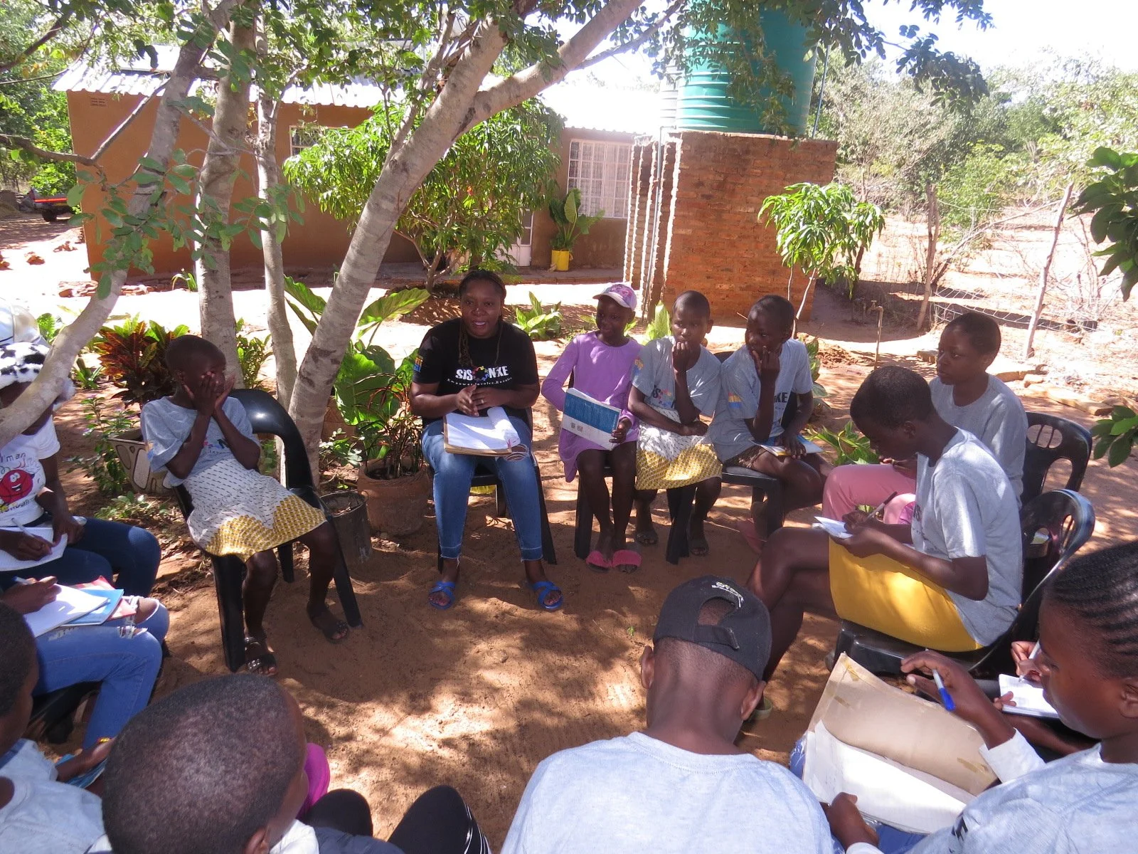 Group of children and a woman sitting on black chairs outdoors under a tree, engaging in a discussion or learning activity, with notebooks in hand.